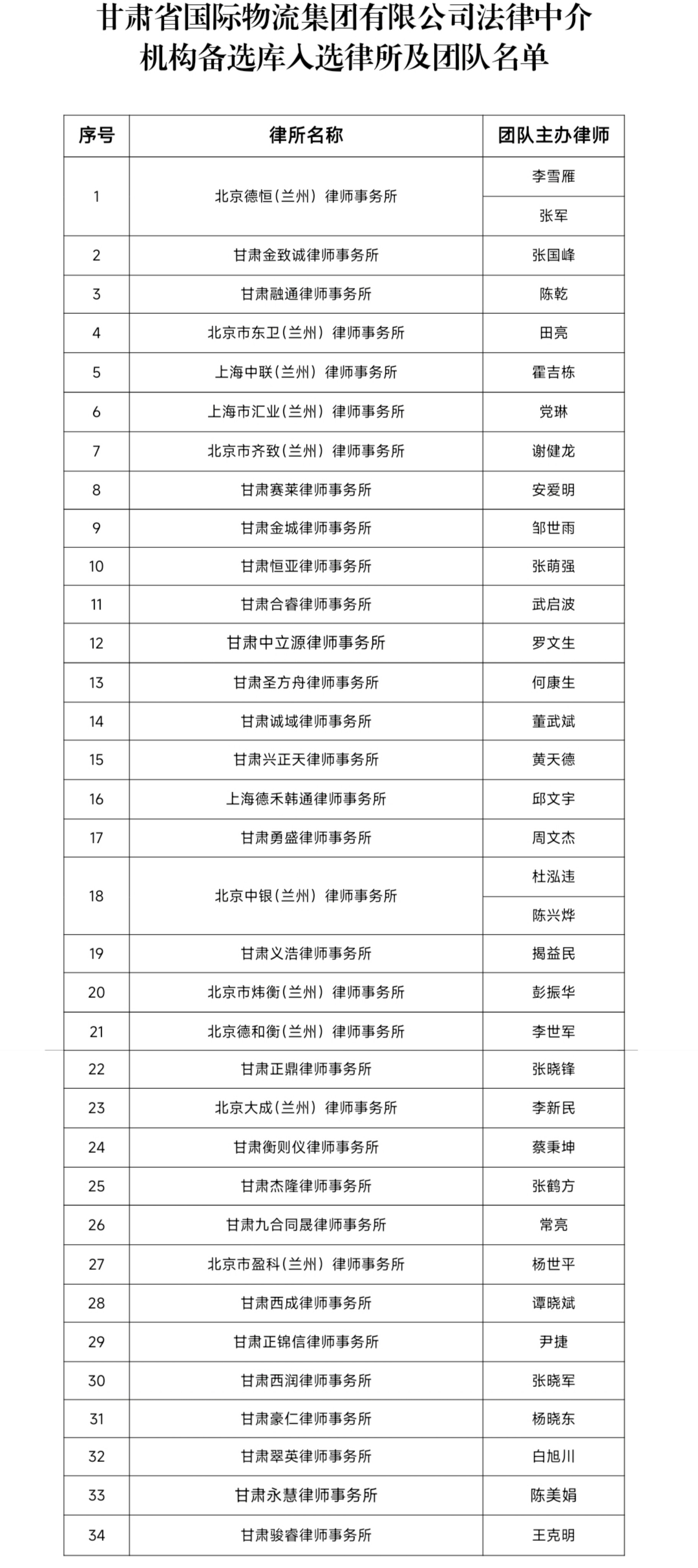 附件:甘肅省國際物流集團有限公司法律中介機構(gòu)備選庫入選律所及團隊名單