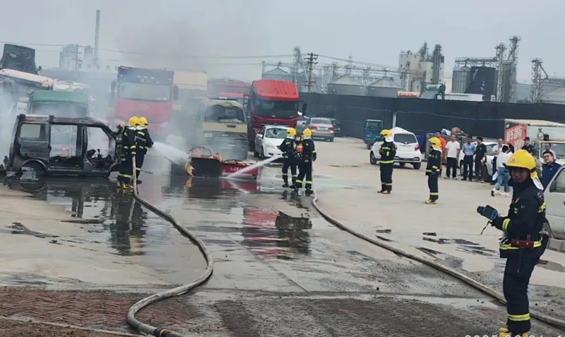 演練現(xiàn)場(chǎng)模擬真實(shí)火情,滾滾濃煙伴隨著熊熊火焰迅速蔓延,安保值班人員第一時(shí)間發(fā)現(xiàn)火情并立即向主要領(lǐng)導(dǎo)上報(bào)情況,同步執(zhí)行應(yīng)急預(yù)案啟動(dòng)工作。工作人員嚴(yán)格按照“119報(bào)警+應(yīng)急小組響應(yīng)”流程,精準(zhǔn)報(bào)告火情位置、火勢(shì)大小等關(guān)鍵信息,由調(diào)度現(xiàn)場(chǎng)行動(dòng)組同步開展火災(zāi)初期處置工作,為消防救援隊(duì)伍抵達(dá)火災(zāi)現(xiàn)場(chǎng)爭(zhēng)取寶貴時(shí)間。大家沿預(yù)定路線快速撤離至安全區(qū)域,在火勢(shì)“蔓延”后,消防救援隊(duì)伍抵達(dá)火災(zāi)現(xiàn)場(chǎng)后,迅速架設(shè)滅火陣地,利用泡沫、干粉等器材完成滅火作業(yè)。在演練總結(jié)環(huán)節(jié),消防救援大隊(duì)對(duì)演練全過程進(jìn)行了專業(yè)細(xì)致的復(fù)盤點(diǎn)評(píng),充分肯定了園區(qū)應(yīng)急響應(yīng)的規(guī)范性和協(xié)同性,并針對(duì)油品起火、煤氣罐起火、車輛起火等常見火情,通過案例解析和實(shí)操演示開展“手把手”教學(xué),取得了良好的演練成效。